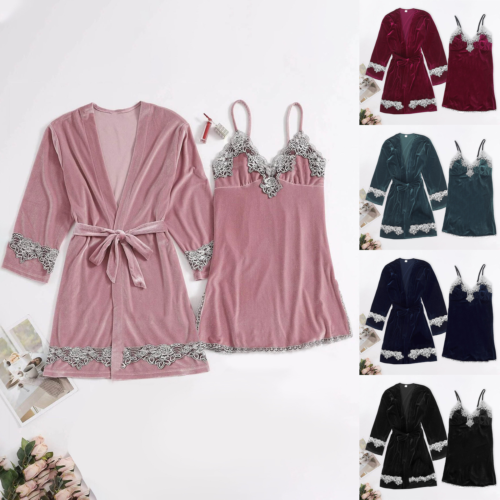 趣味の下着欧米の爆発的なセクシーなレースの金のベルベットのストラップレースの朝の服の女性の居住服の2つのセットの源