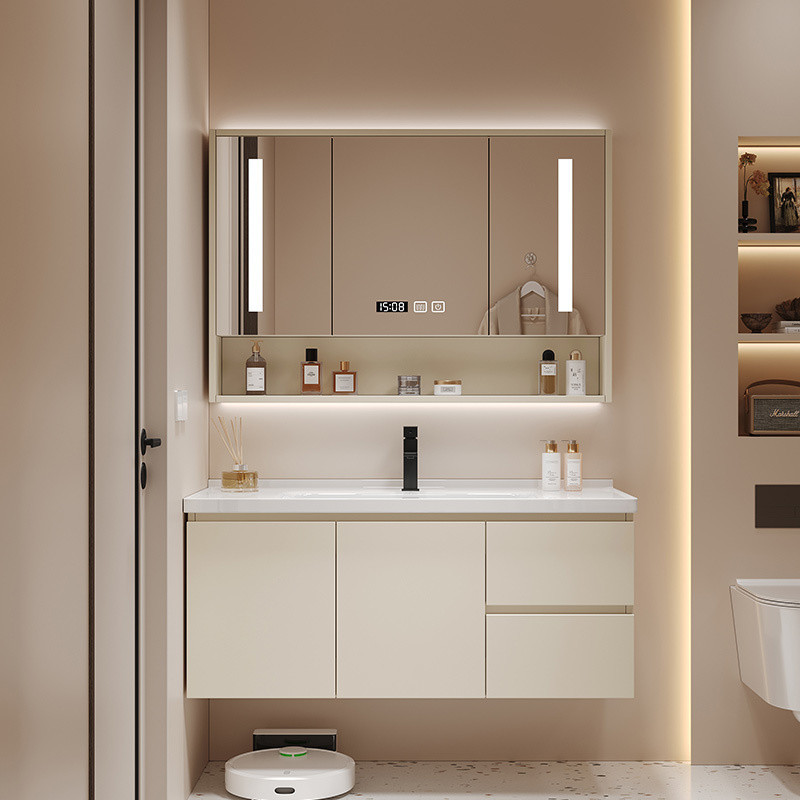9saシンプルトイレ実木洗面台クリーム色浴室キャビネットセラミック一体洗面器洗面器キャビネットセット