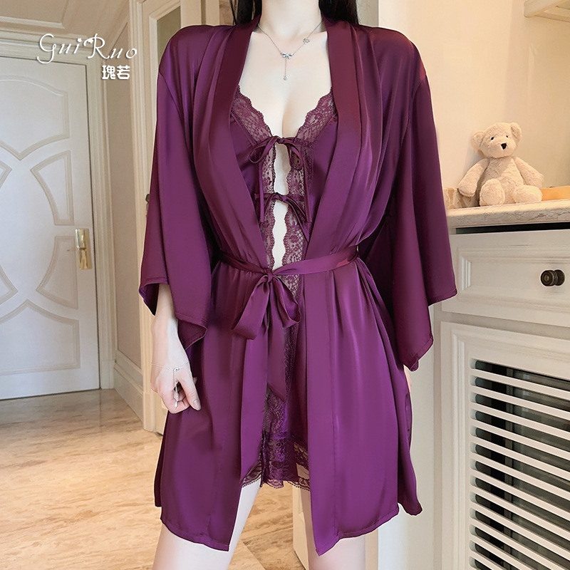 豪華なシルキーサテン下着、情熱的でホットな胸パッド付き、純粋な欲望の刺繍メッシュナイトガウン、女性用ローブセット 5358