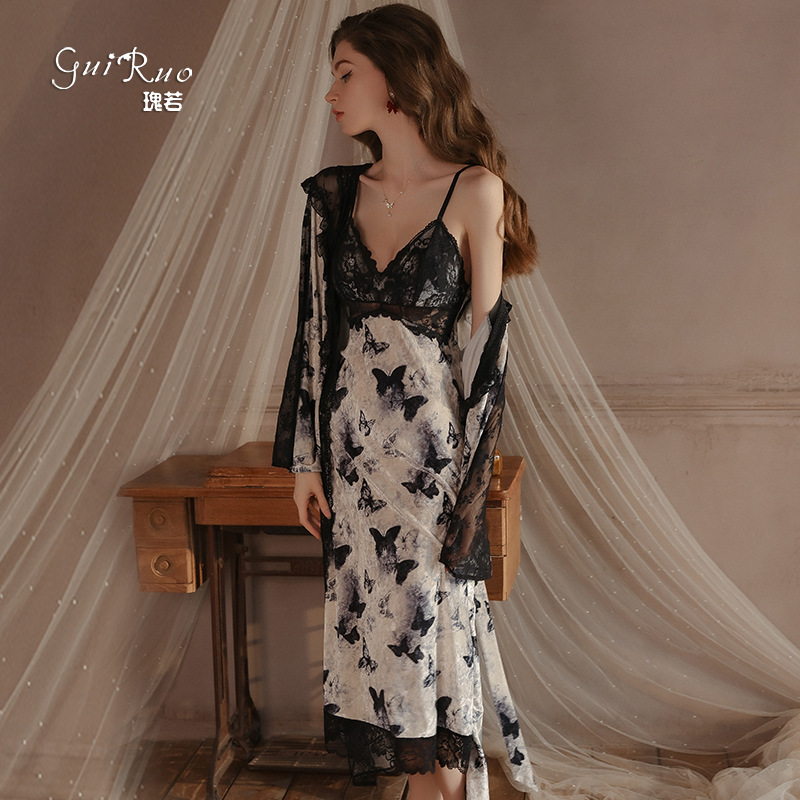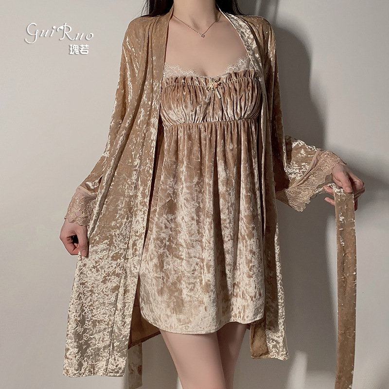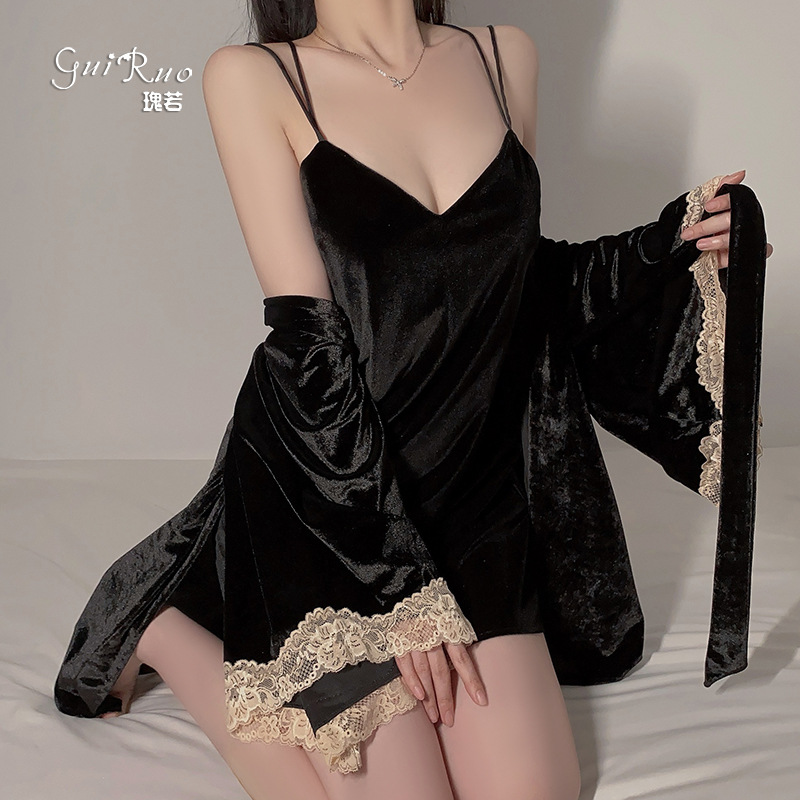 豪華で軽いベルベットのランジェリー、シースルーレース、パッド入りサスペンダーナイトガウン、大きいサイズのホームスーツ 4827