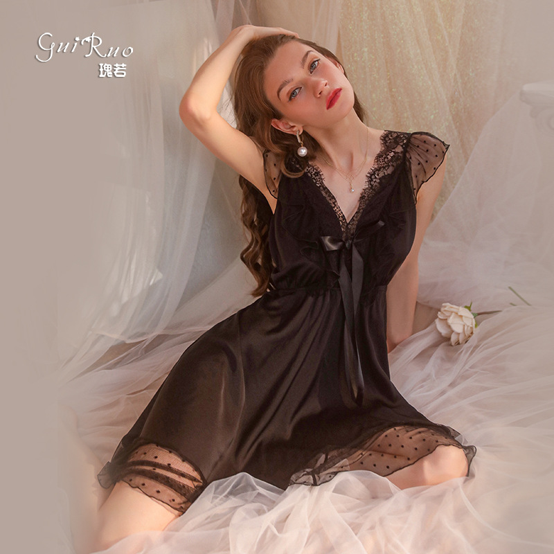 バラのセクシーな深いvと胸のパッドのベルベットのレースの透視ボタンの装飾はやせている女性の部屋の服のパジャマのスカートの3863を現します。