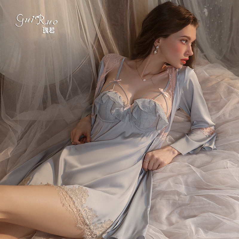 グレイロブランドの純粋な欲望を表現する、大きいサイズのセクシーな深いVネック、レースの縁取り、無地のサテン生地、背中が開いたキャミソールドレスのホームウェアセット966