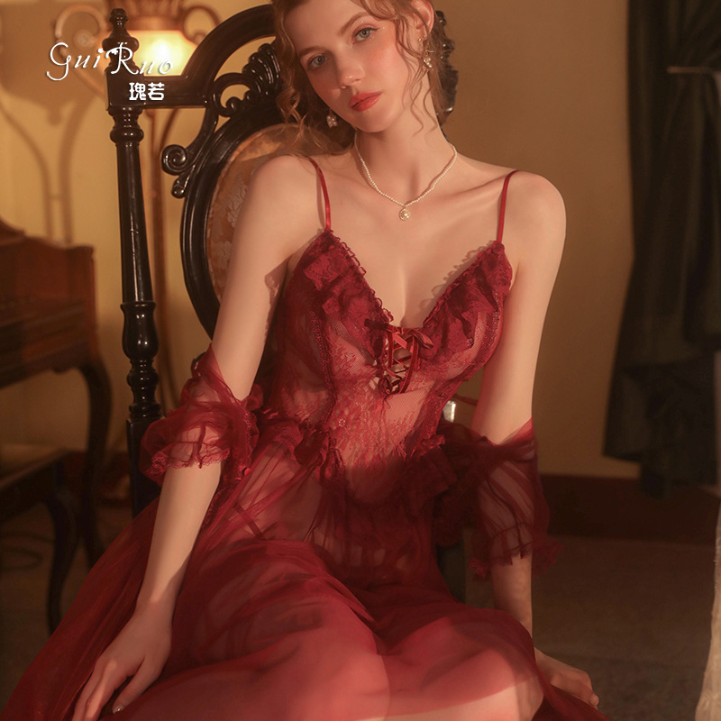 DZバラのセクシーなガーターの睡眠のスカートの網の糸の透視の魅力の深いvの長いスカートの快適な上着の家の服のスーツ
