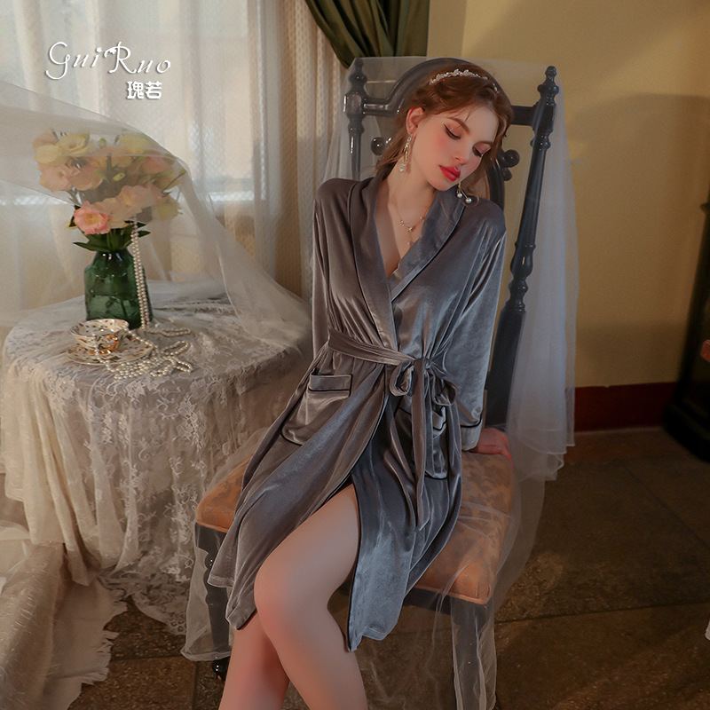 バラのようなセクシーなベルベットの襟が腰の寝服を収めて快適でシンプルで、女性の上着を着ることができる家庭服セットp2819