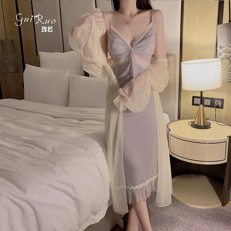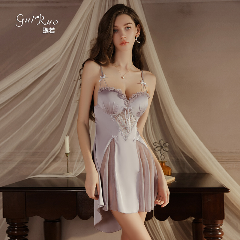 Guiruo Pure Desire セクシーなパジャマ甘いレースホットディープ V プラス胸パッド寝間着アウターローブホーム女性セット 4955