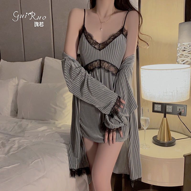 バラのセクシーな深いvベルベットのパジャマレースの透視純欲風ストラップの寝スカートの上着の女性の家の服のスーツ622