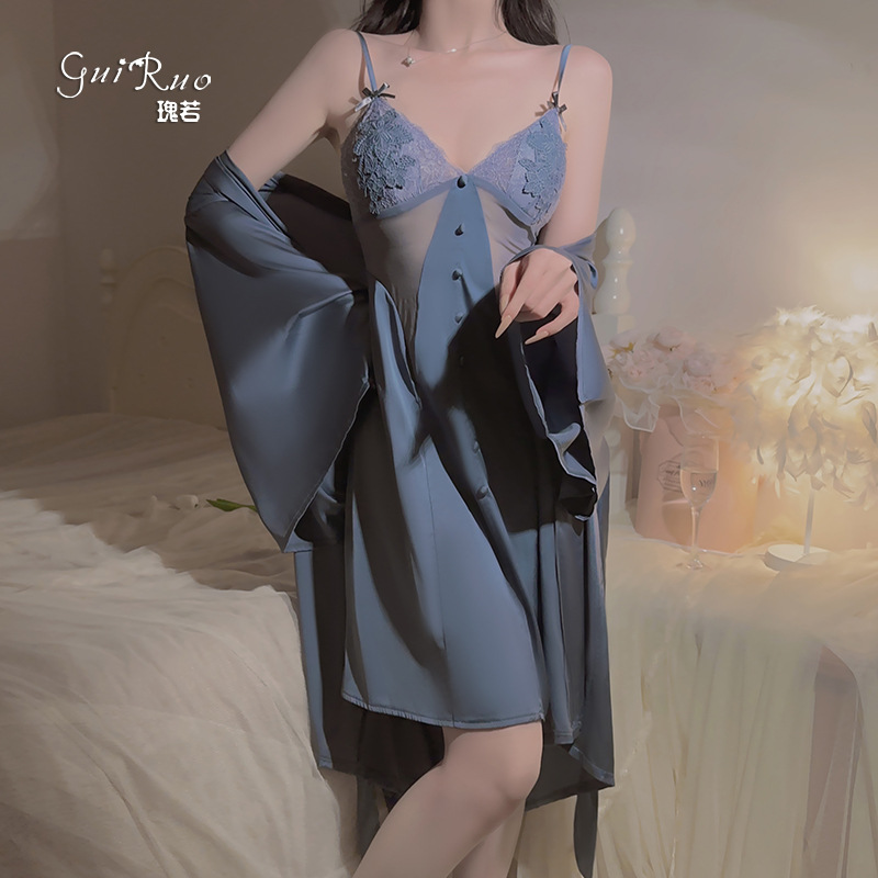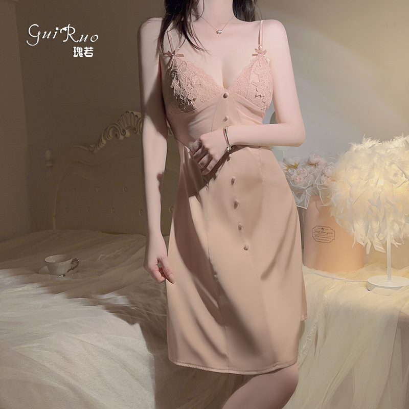 バラのようなセクシーな深いv刺繍レースと胸パッドのボタンで寝ているスカートの上着の家の服のセット3379