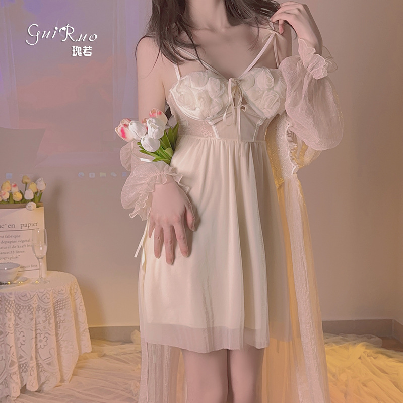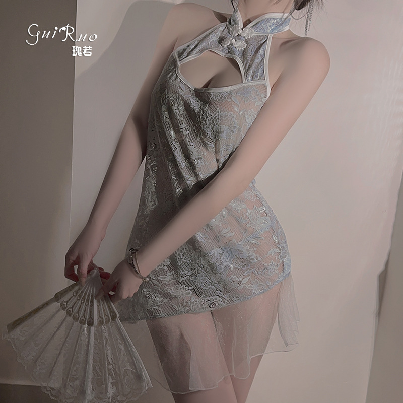 バラのセクシーな透視網の糸の復古的な立襟の盤は透かしを彫って背中の純粋な欲望の制服の情緒の寝スカートのスーツの3681を現します。