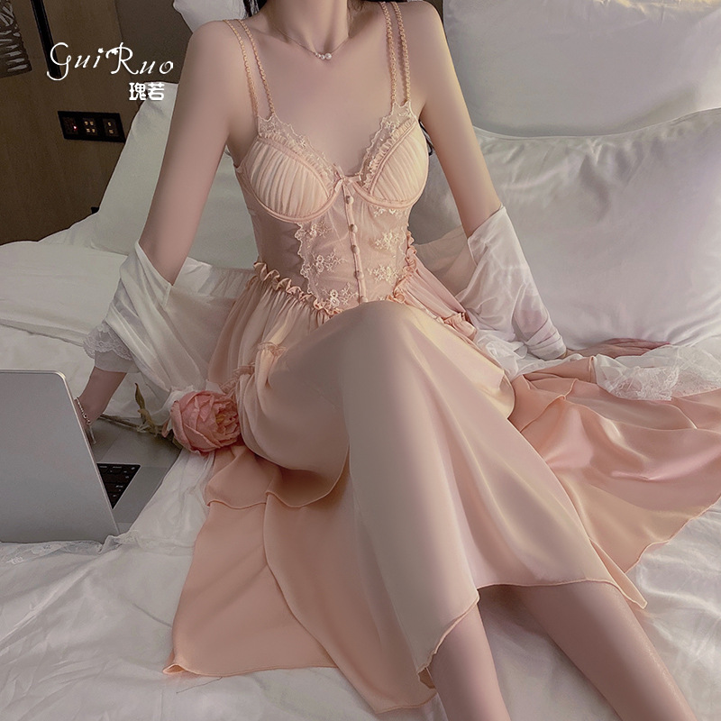 バラのようなセクシーな積み重ね襟の氷糸プリントの純粋なストラップの寝たいスカートの網糸レースの上着の家の服のスーツ3777