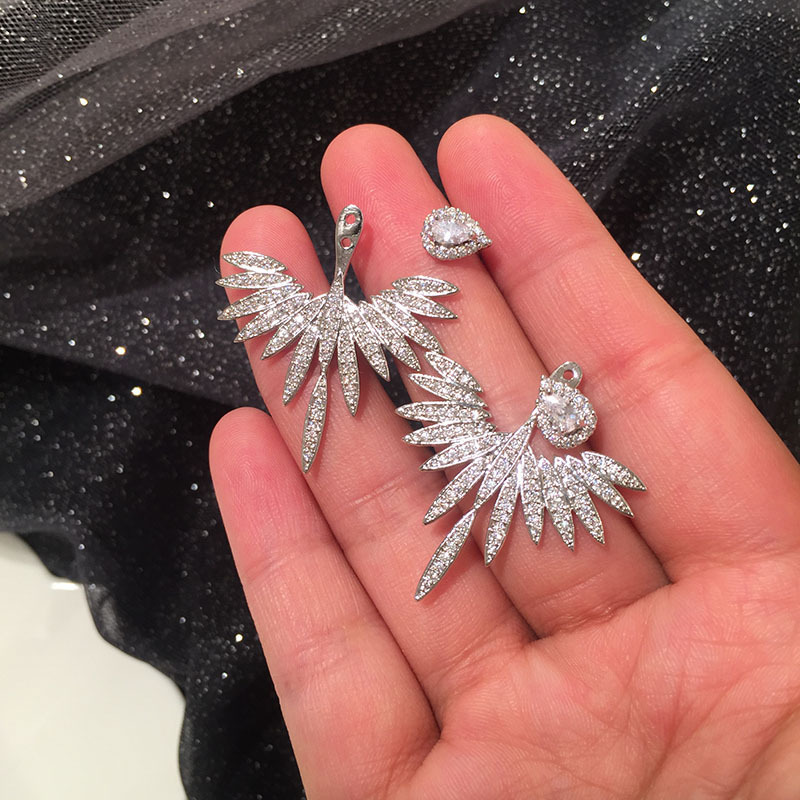クロスボーダーの人気銅メッキプラチナ韓国版シンプルで個性的なファッション前後の両用マイクロジルコンの天使の翼のピアス