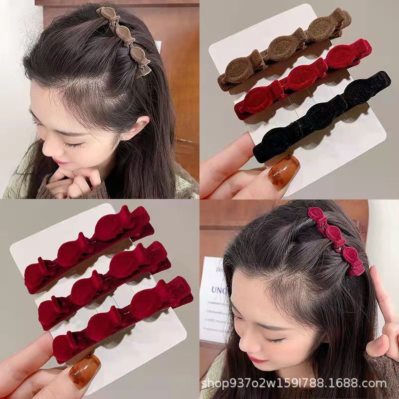 植毛編みヘアクリップ側の前髪の木目が砕けて髪を整理します。