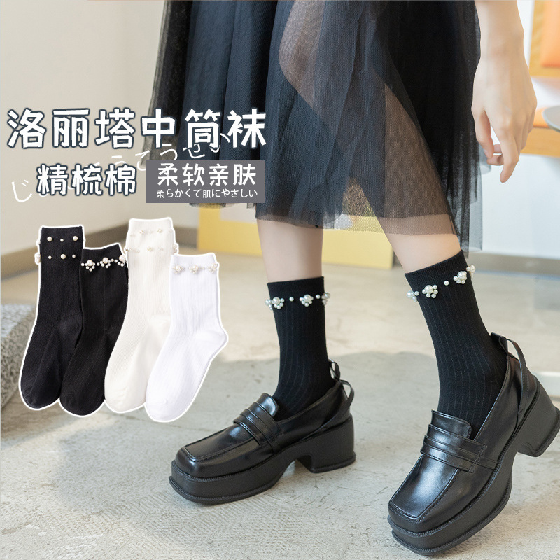 新品レディース靴下一回りパール半花二列白黒jk系ミドルソックス学院風アクセサリー個性的ソックス