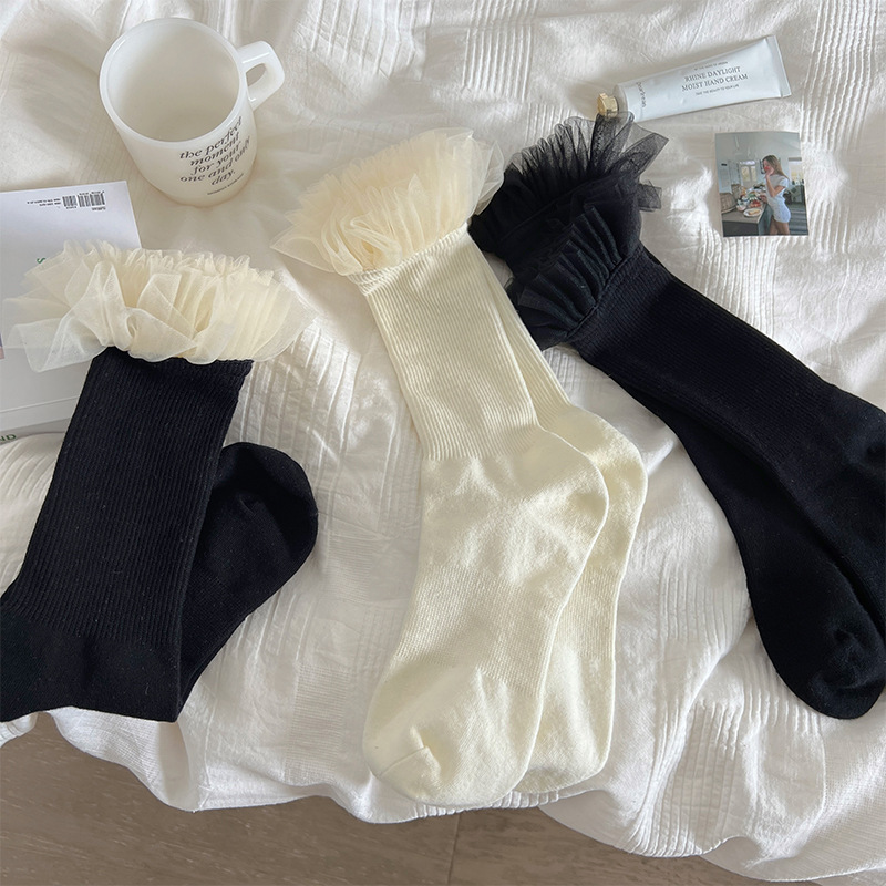 2025 ロリータレースガールソックス秋と冬の新無地リボン妖精スタイルレースミッドチューブソックス S