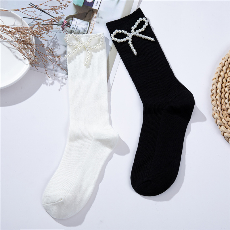 2025新商品の女性靴下一回り真珠半花二列白黒jk系中筒靴下学院風アクセサリー