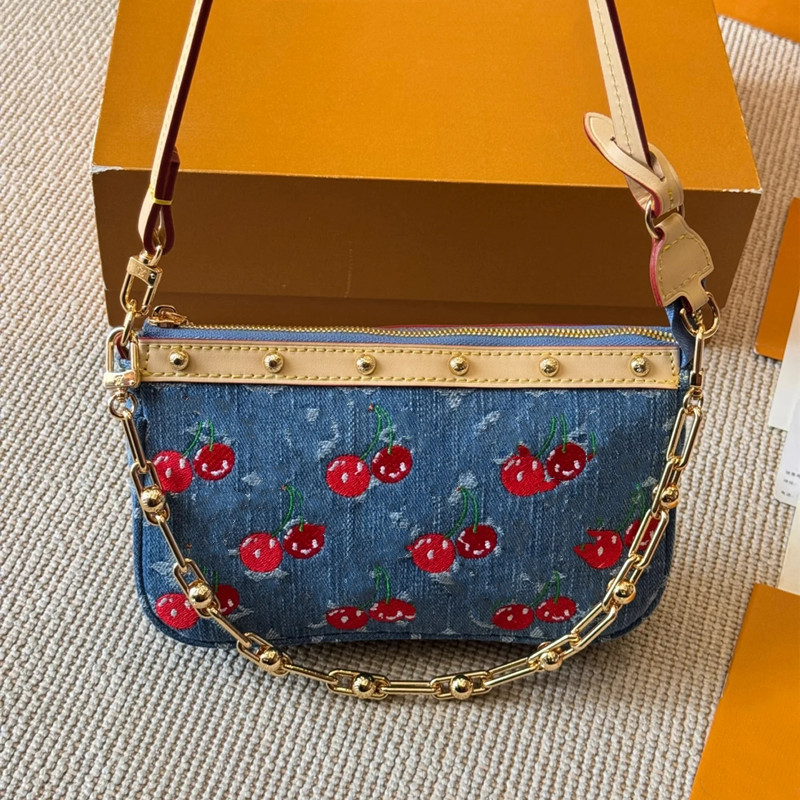 新しいハイエンド脇の下バッグチェリーデニムデニムレディースチェーン麻雀バッグ封筒バッグシングルショルダークロスボディハンドバッグ
