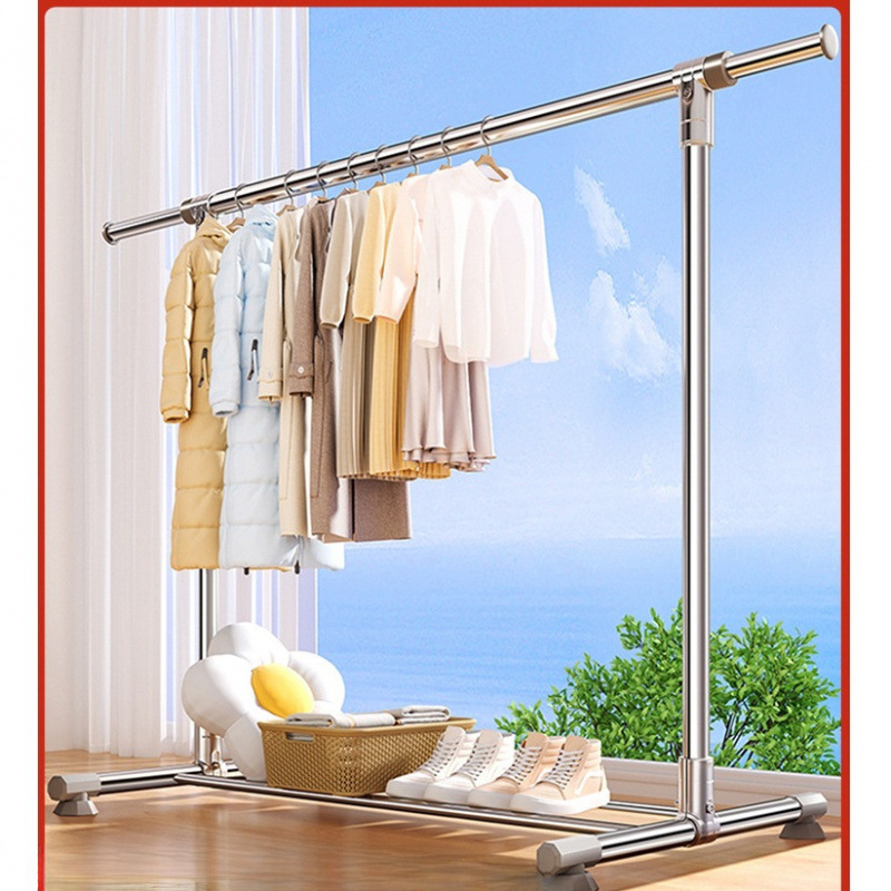 鋼管物干しラック床置き家庭用寝室バルコニー洋服ラック伸縮式シングルロッド物干しラックシンプルな衣類ラック