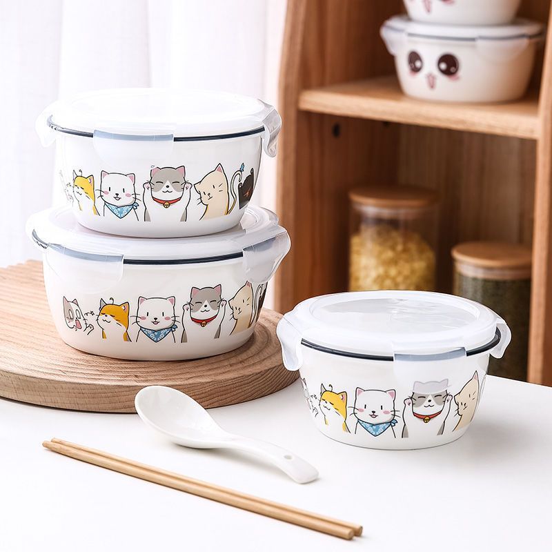 仕事用大型弁当箱、蓋付きセラミック鮮度保持ボウル、電子レンジ対応、学生用密封インスタントラーメンボウル、家庭用ゼロ容量