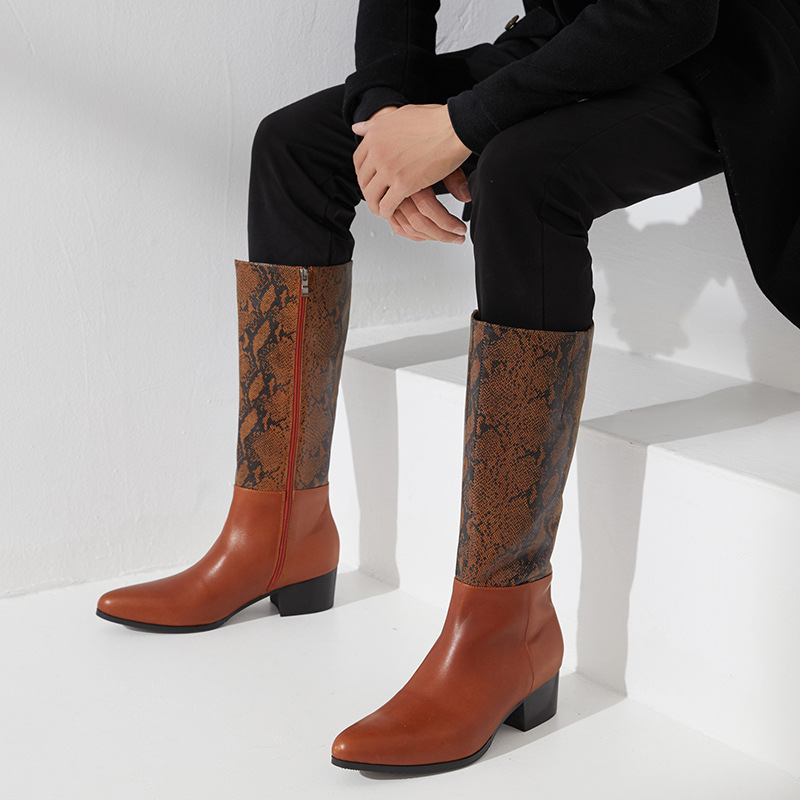 欧米の男性の先端ファッションブーツ茶色のアナコンダの紋様のエンボス牛革ブーツのブーツ