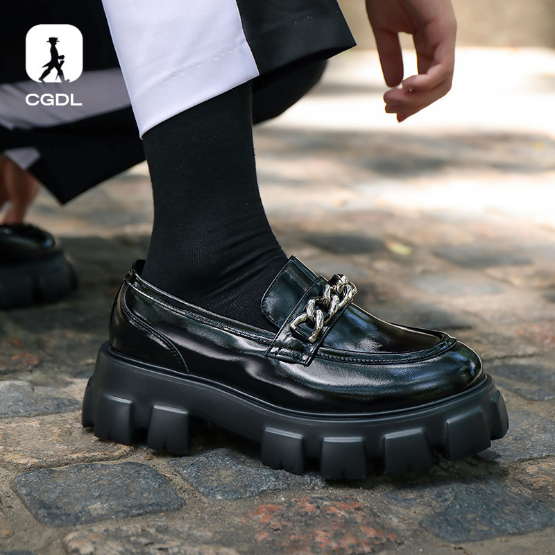 オリジナルの本革の大頭の徳比靴の男性の暗い風のファッションの厚い底の高くなる側はチェーンのカジュアルな靴を遮ります。