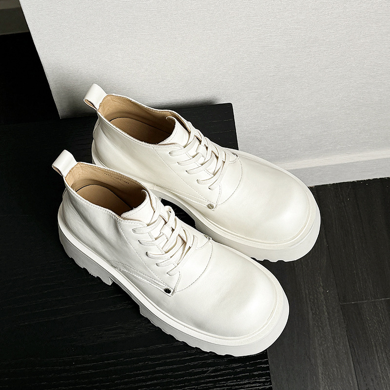 新しい白いマーティンブーツの男性は6cmの厚い底のショートブーツの全牛革の高級感の徳比の皮のブーツを増加します。