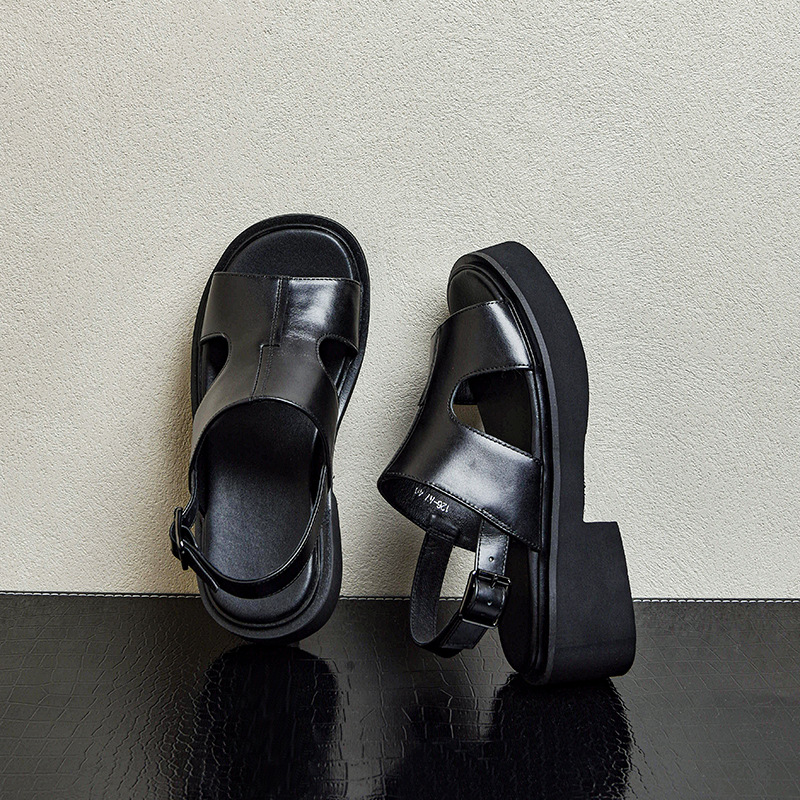 夏の外は暗い風の金属のバックルの厚い底のサンダルを着ています。