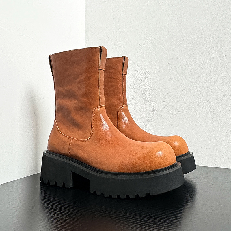 黄色の茶色の頭層牛革マーティンブーツ男の厚い底が高くなりました。