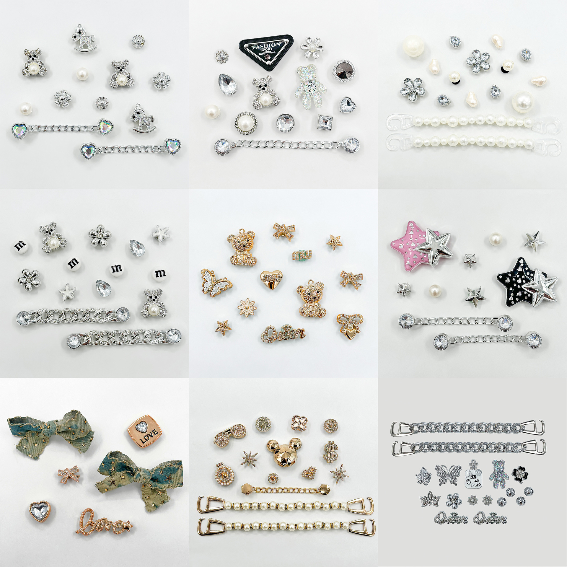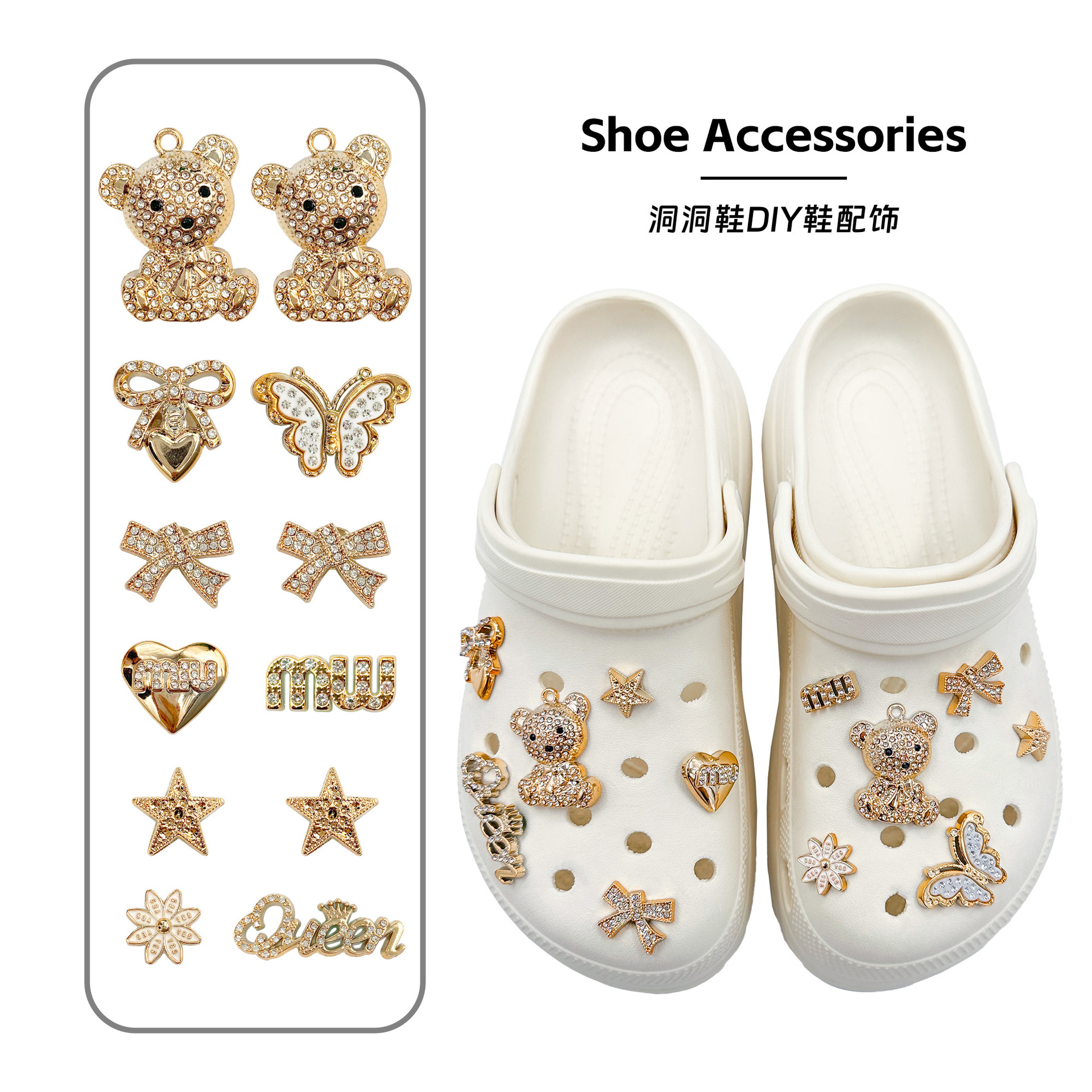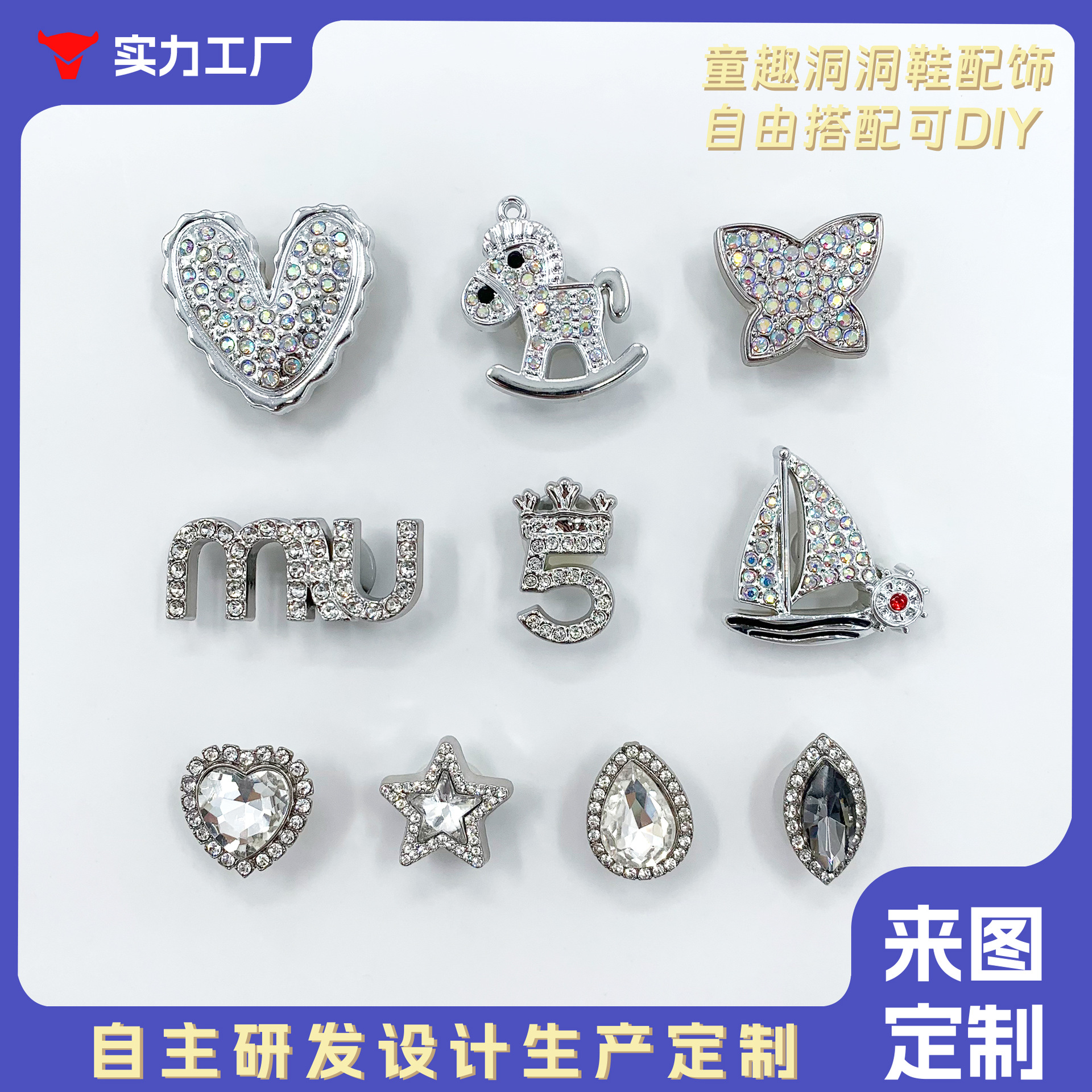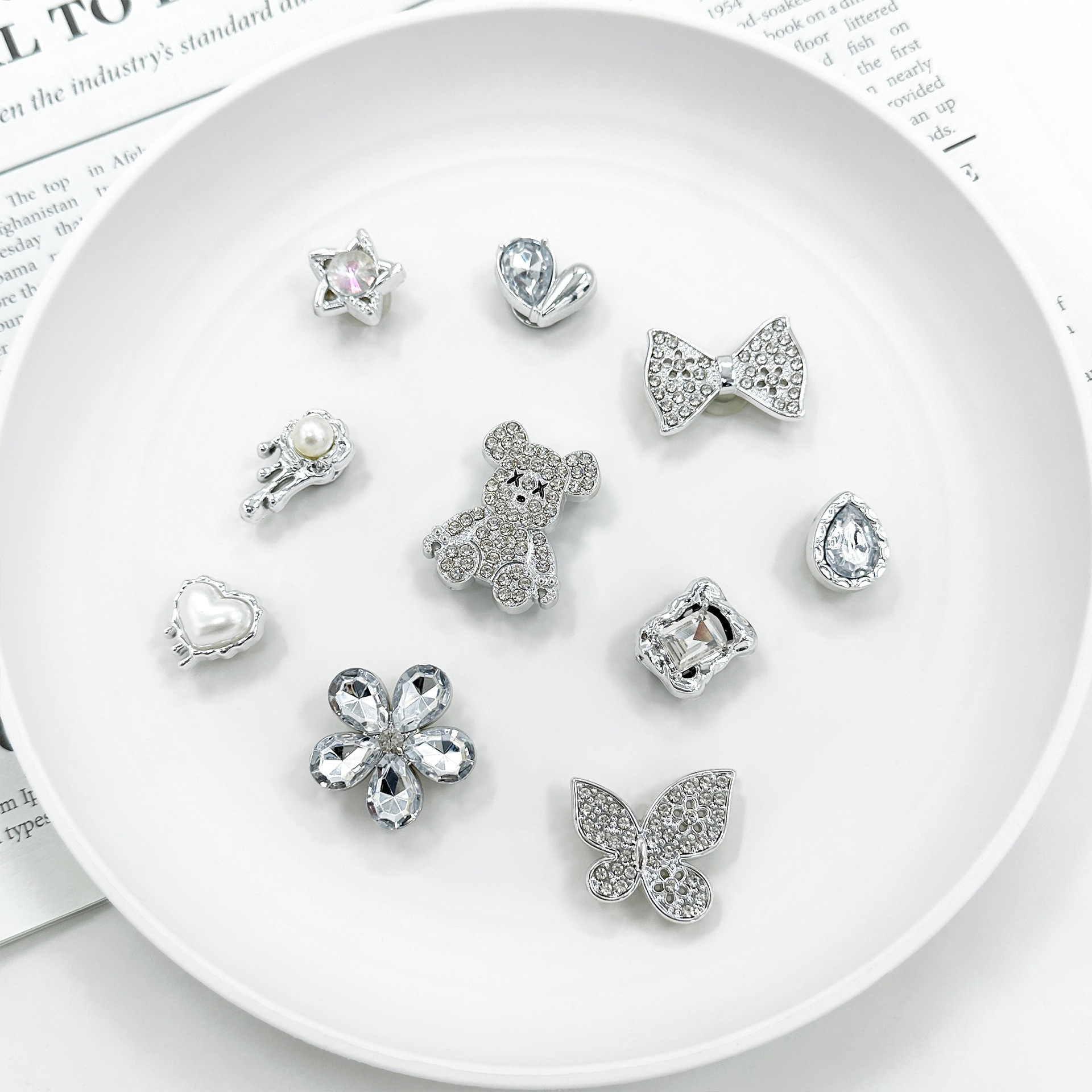 2024新型立体水ドリル穴靴アクセサリーdiy立体かわいい銀色系装飾靴ボタン部品取り外し可能