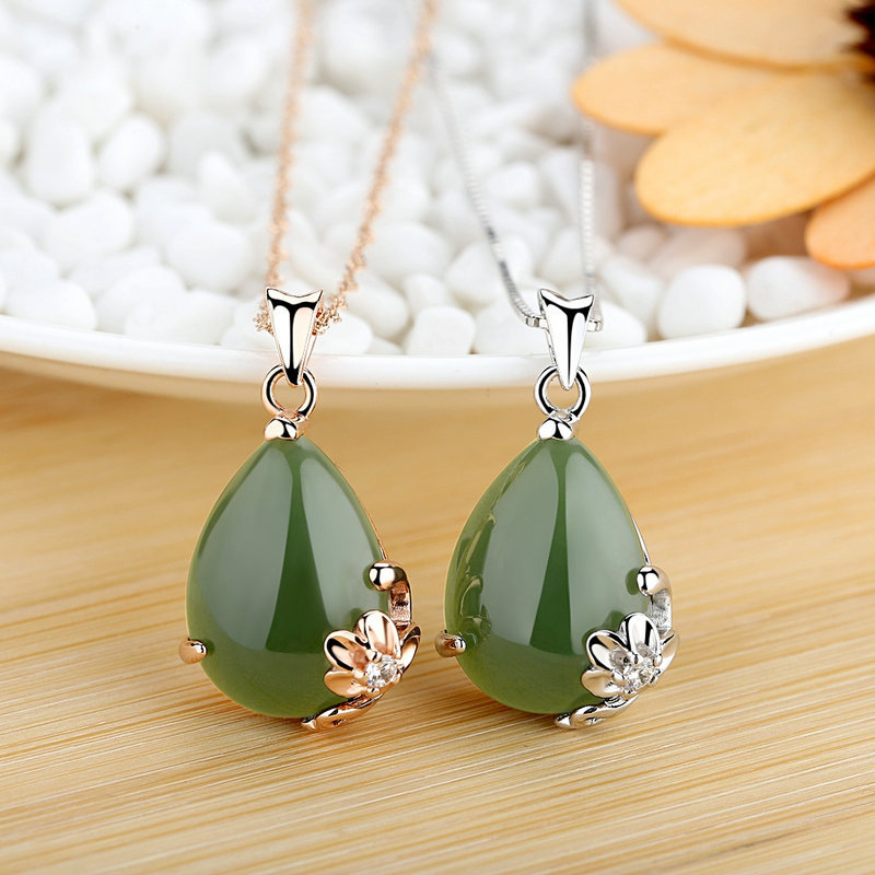 A440純銀和田玉碧玉花びら水滴ペンダント銀飾りペンダント