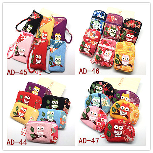 布芸チャックバッグ # ad-46招喜屋フクロウ刺繍財布携帯電話バッグ