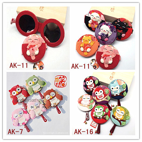 フクロウ柄鏡 # AK-7.11.16和風布芸フクロウ携帯化粧鏡