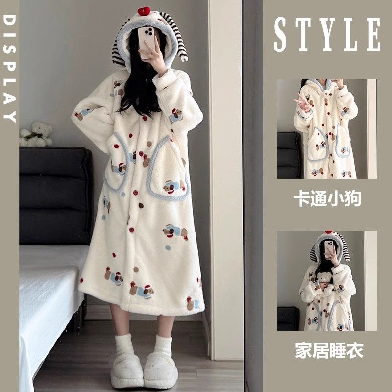かわいい漫画風小さなアライグマ柄のコーラルベルベットパジャマ 女性用 2025年新作 冬用厚手ナイトガウン 外出着としても使えるルームウェア