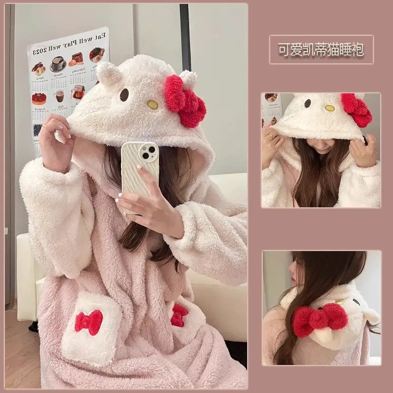 リボンの小さい猫のマントの寝衣のサンゴの絨毛のパジャマの女性の秋冬の2025新型の厚い寝スカートの家の服