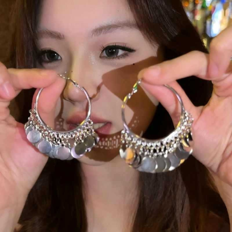 クロスボーダー新製品イヤリング、ハイエンドの光沢のある誇張されたディスクタッセルイヤリング、ファッショナブルでエレガントな大きなサークルイヤリング