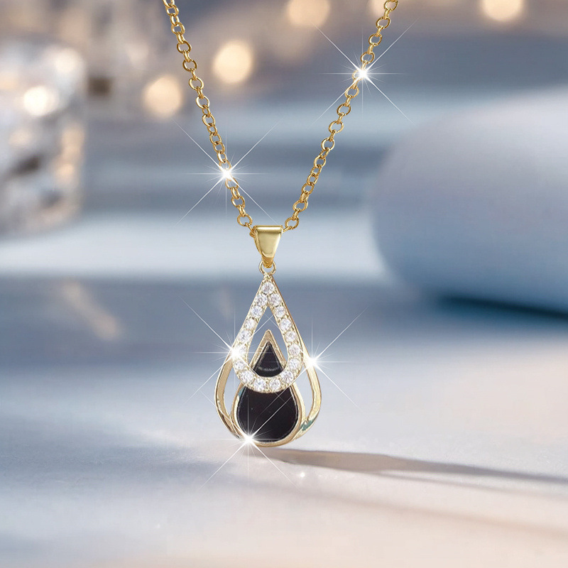 韓国スタイルのファッショナブルな黒の中空二層ウォータードロップペンダントネックレス新しい幾何学的なダイヤモンドがちりばめられたニッチな気質コールドスタイル