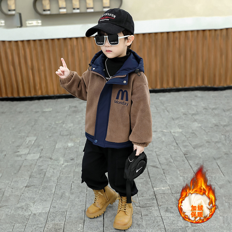 男児の秋にベルベットのコートを入れた2024の新型韓国版かっこいい赤ちゃんの冬服のフリースは保温綿服の潮を厚くした