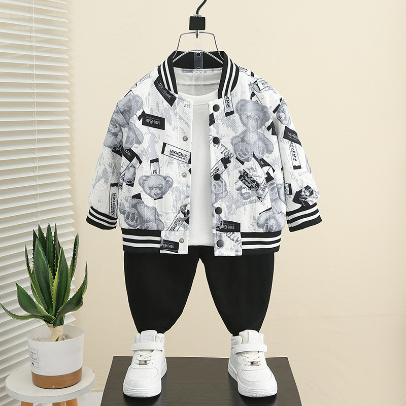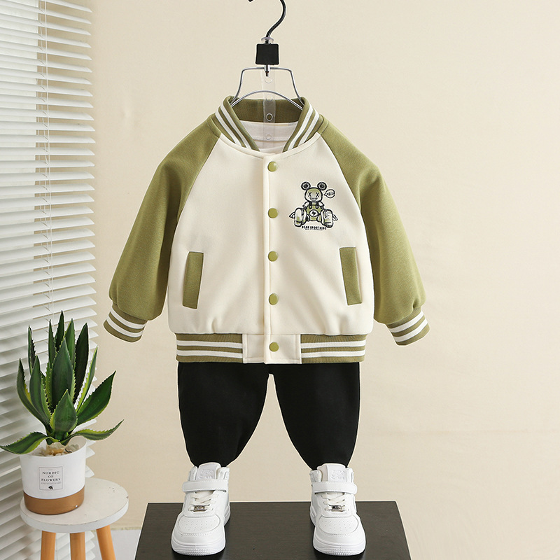 2025年新作子供用秋服ジャケット、男の子用漫画風クマ柄野球ユニフォーム、おしゃれなベビー春秋ジャケット、トレンド