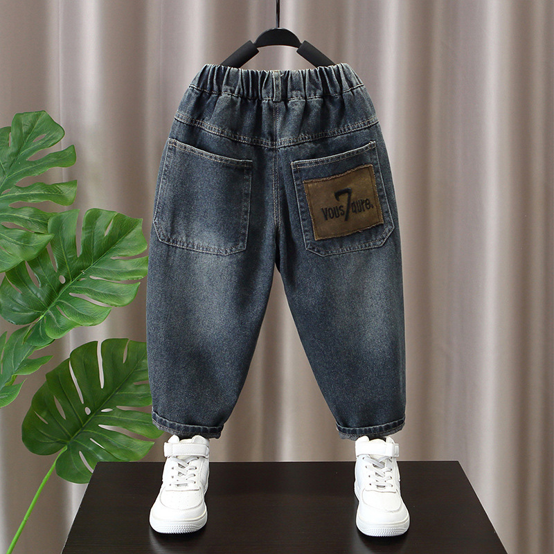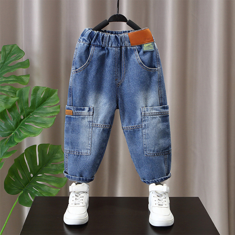 男の子の春秋タイプの長ズボンの子供の洋風の流行のズボンの赤ちゃんの中で子供の秋の揚げ物のジーパンの2024新型