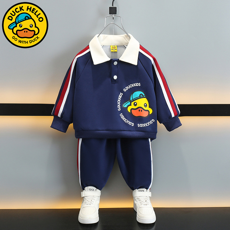 小黄鴨2024新型男児レジャースポーツスーツ春秋児童襟poloシャツ流行2点セット潮