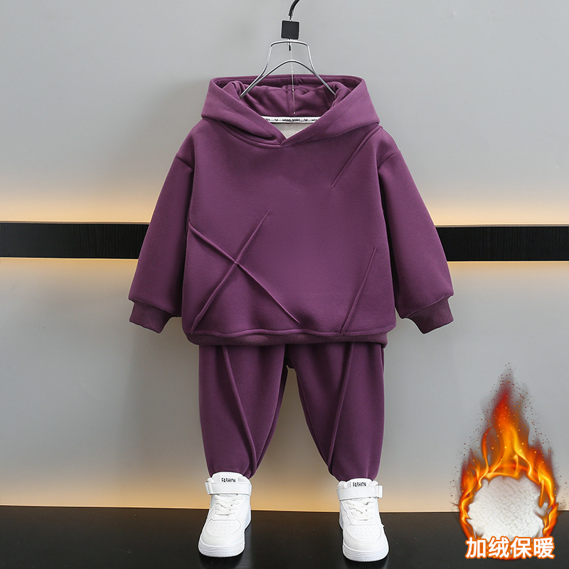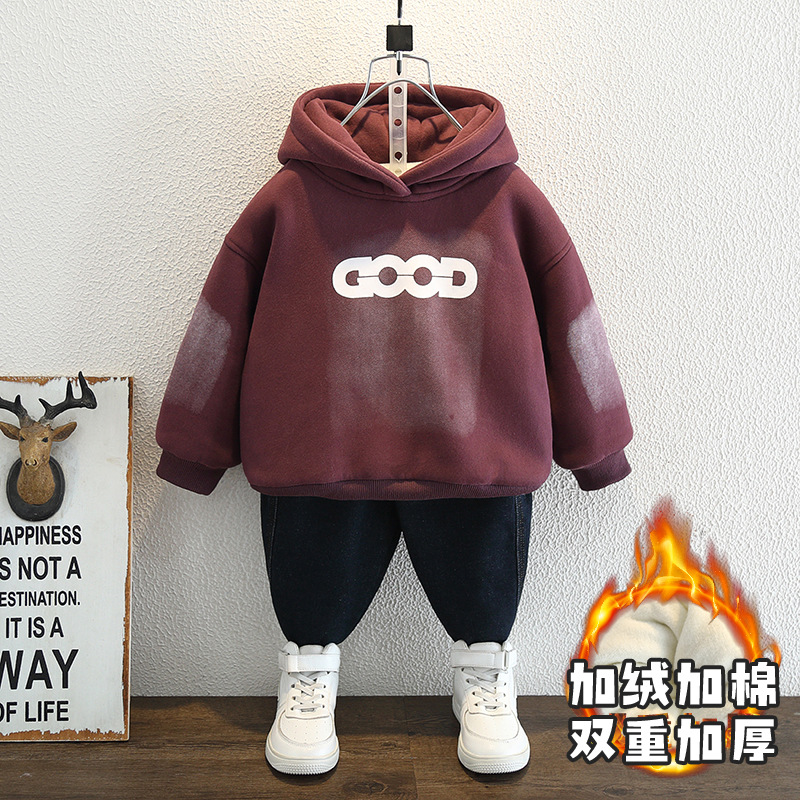 男の子用一体型フリーススウェットセット、裏起毛秋冬2025新作、子供用厚手おしゃれ男の子服