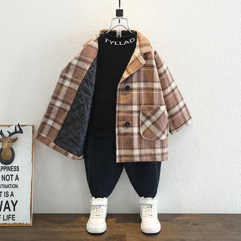 男の子の格子の毛のコートは秋冬2024の新型の子供を挟んで綿を厚くします。