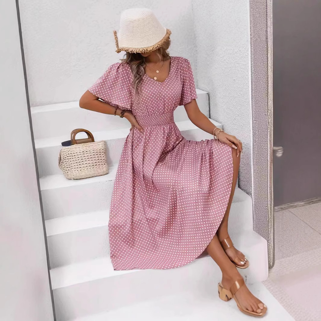現物2025amazonクロスボーダーTEMU波点プリントウエストの優雅な半袖vネックa字スカート春夏婦人服