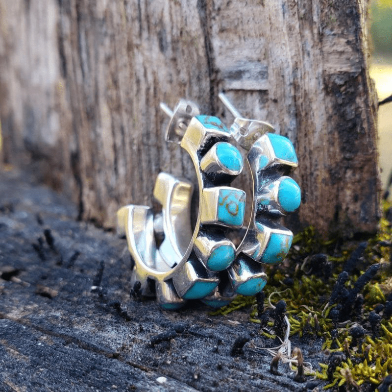国境を越えて人気のあるクリエイティブなレトロな金属彫刻リングイヤリングに合成松石イヤリングをはめ込んだ女性卸売り