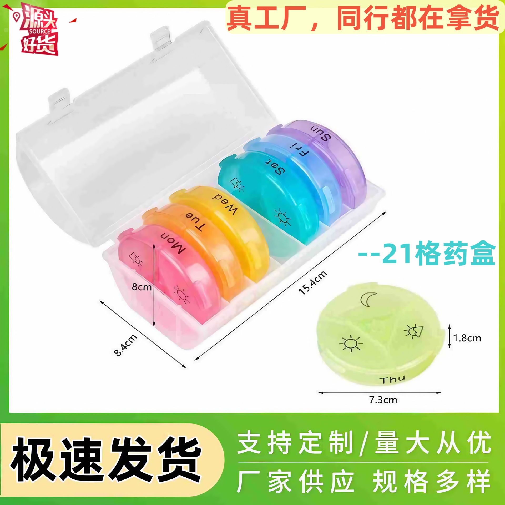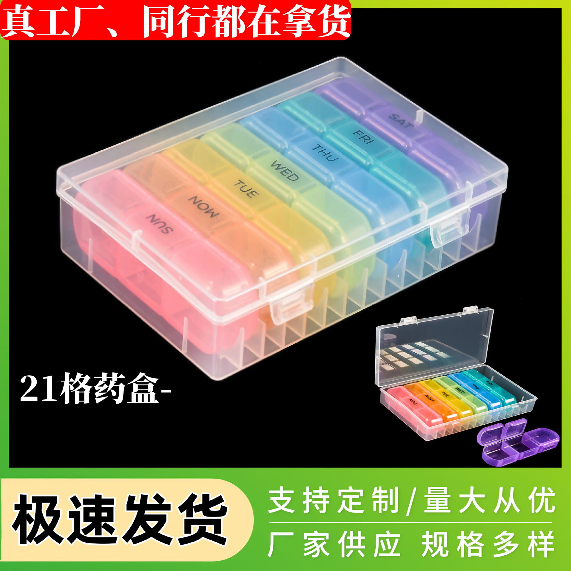 新型14グリッド1週間用ピルケース、越境EC向け、黒色21グリッド7日間レインボーポータブル旅行用包装箱
