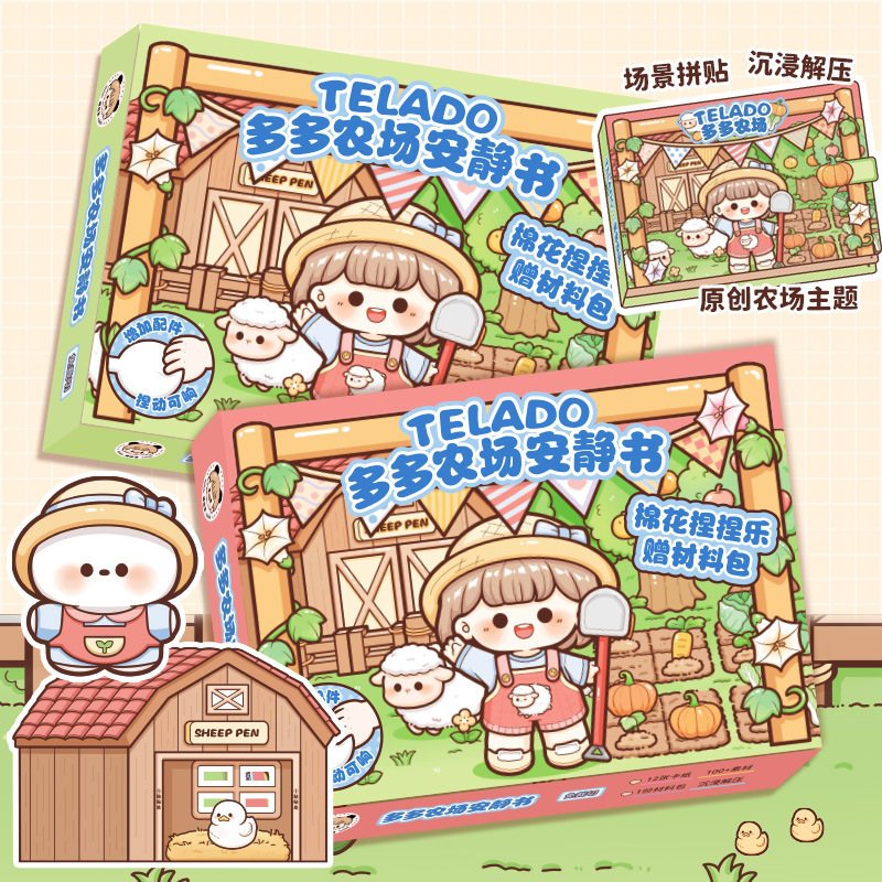 ティラードはたくさんの農場の静かな本をつまんでいます。子供はおもちゃの手帳を解凍します。