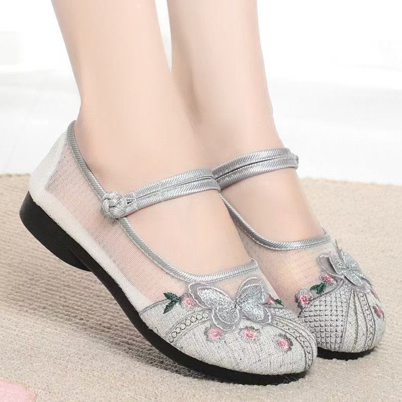 夏メッシュ通気性漢服平底ソフトソールエスニック刺繍靴メッシュ靴中空北京布靴ママホームシューズ