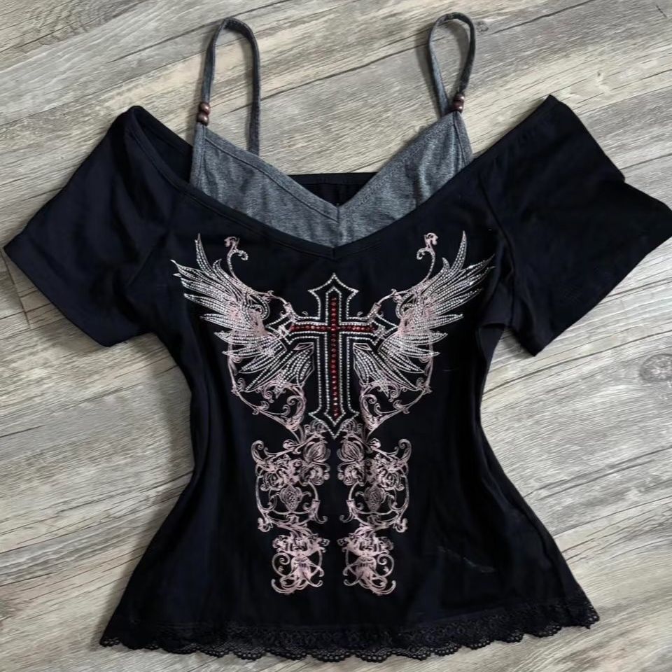 ヨーロッパとアメリカのプラスサイズの女性アメリカンロックスタイルミレニアムサブカルチャーレトロホットガールプリントホットダイヤモンドTシャツレースフェイクツーピース