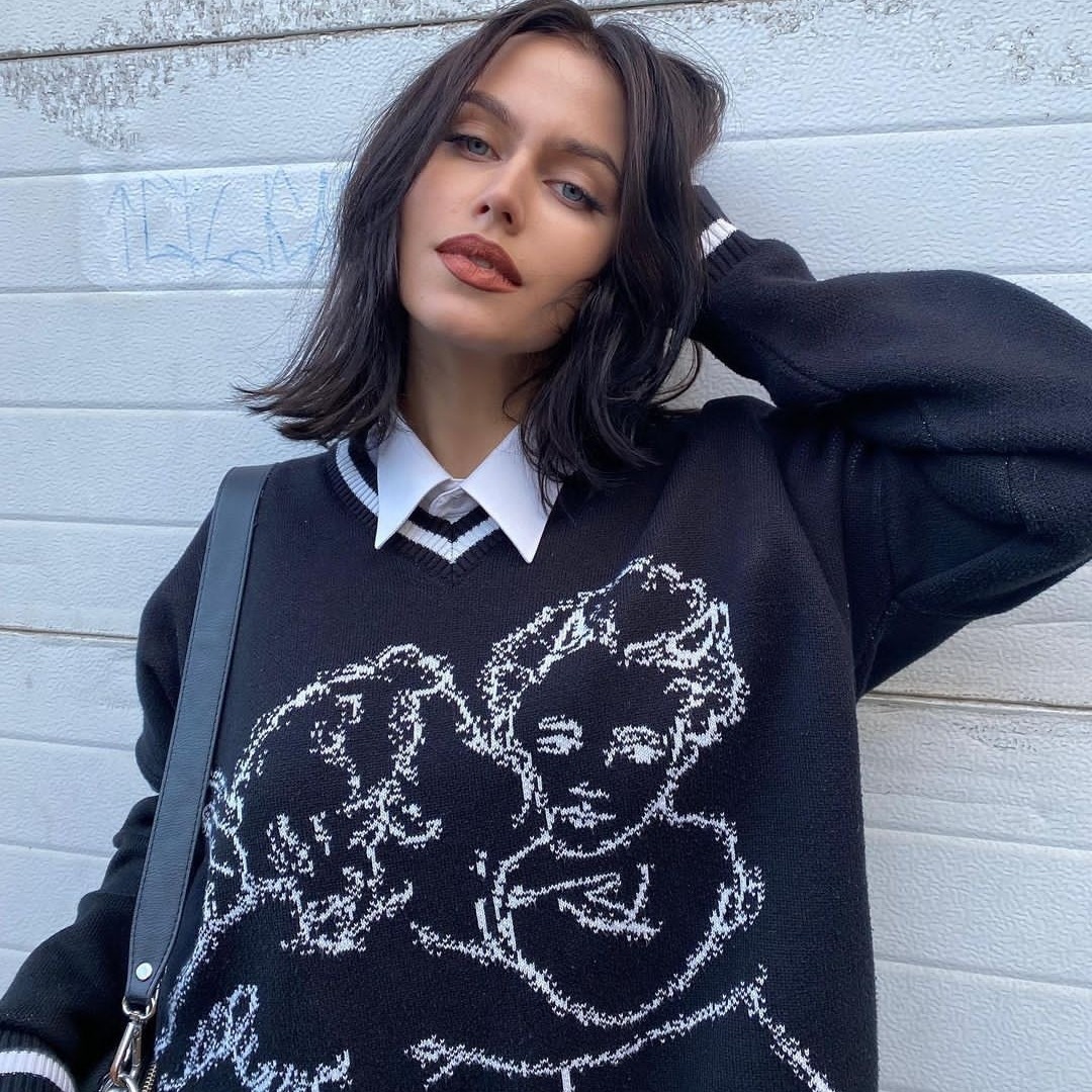 欧米の黒い天使のジャカードの頭のゆったりしたニットの気質の大きいサイズのゆったりした婦人服のvネックの長袖の男性のセーター