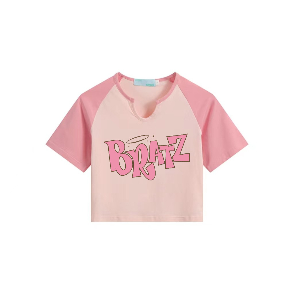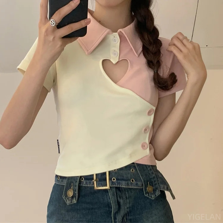 ギャルの短いタイプの臍の肩の袖の牛乳の糸のキャンディーの色のvネックの半袖のデザイン感のプリントの腰の桜の花粉の上で