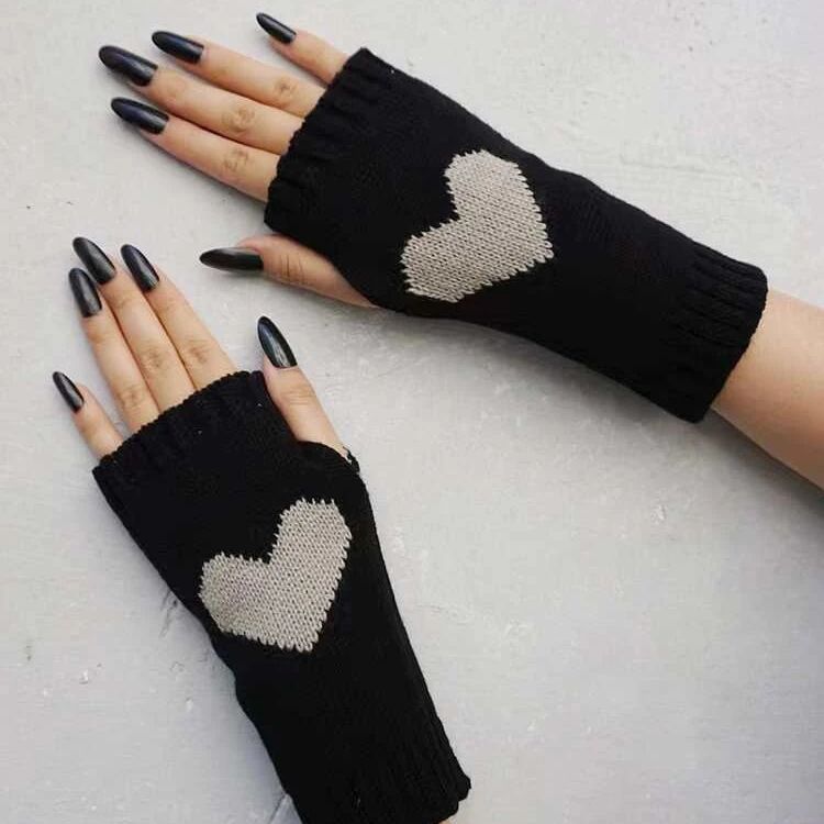 秋冬ファッション毛糸愛ジャカード女性半指露指手袋弾力保温ニット袖半分手袋