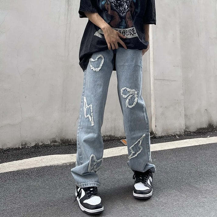 ファッションの個性的なメンズジーンズの愛の稲妻は布の刺繍を貼ります。